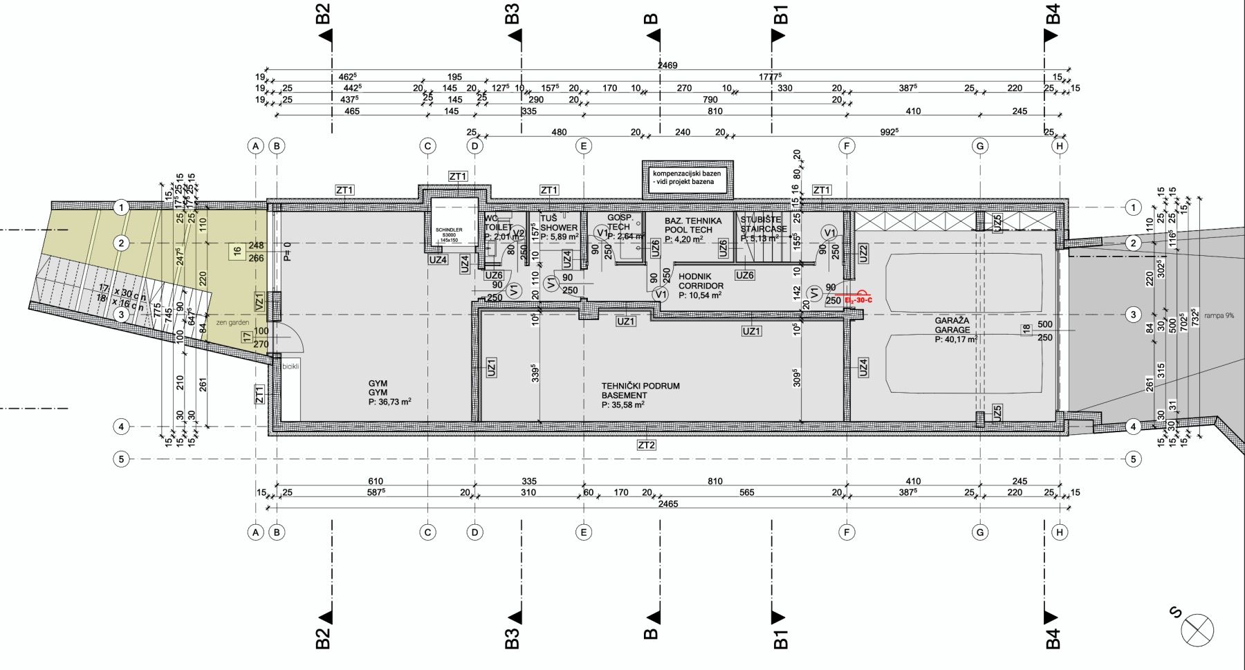 Privatna garaža za dva automobila te prostrana spremišna ili tehnička zona ukupne površine od približno 50 m2.
