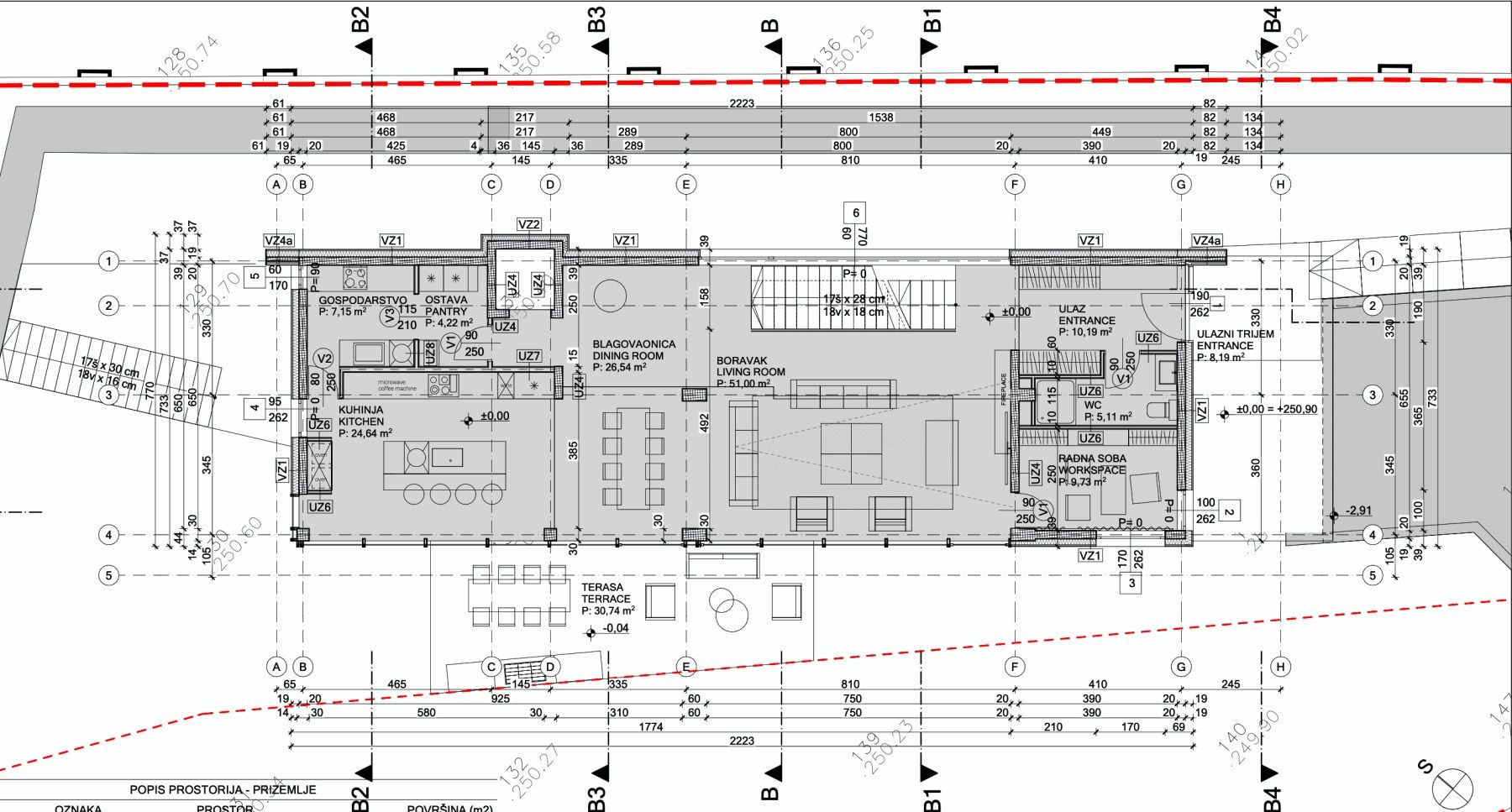 Open space dnevni boravak, kuhinja i blagovaonica s izlazom na terasu i vrt, gostinjski toalet i ulazni prostor.