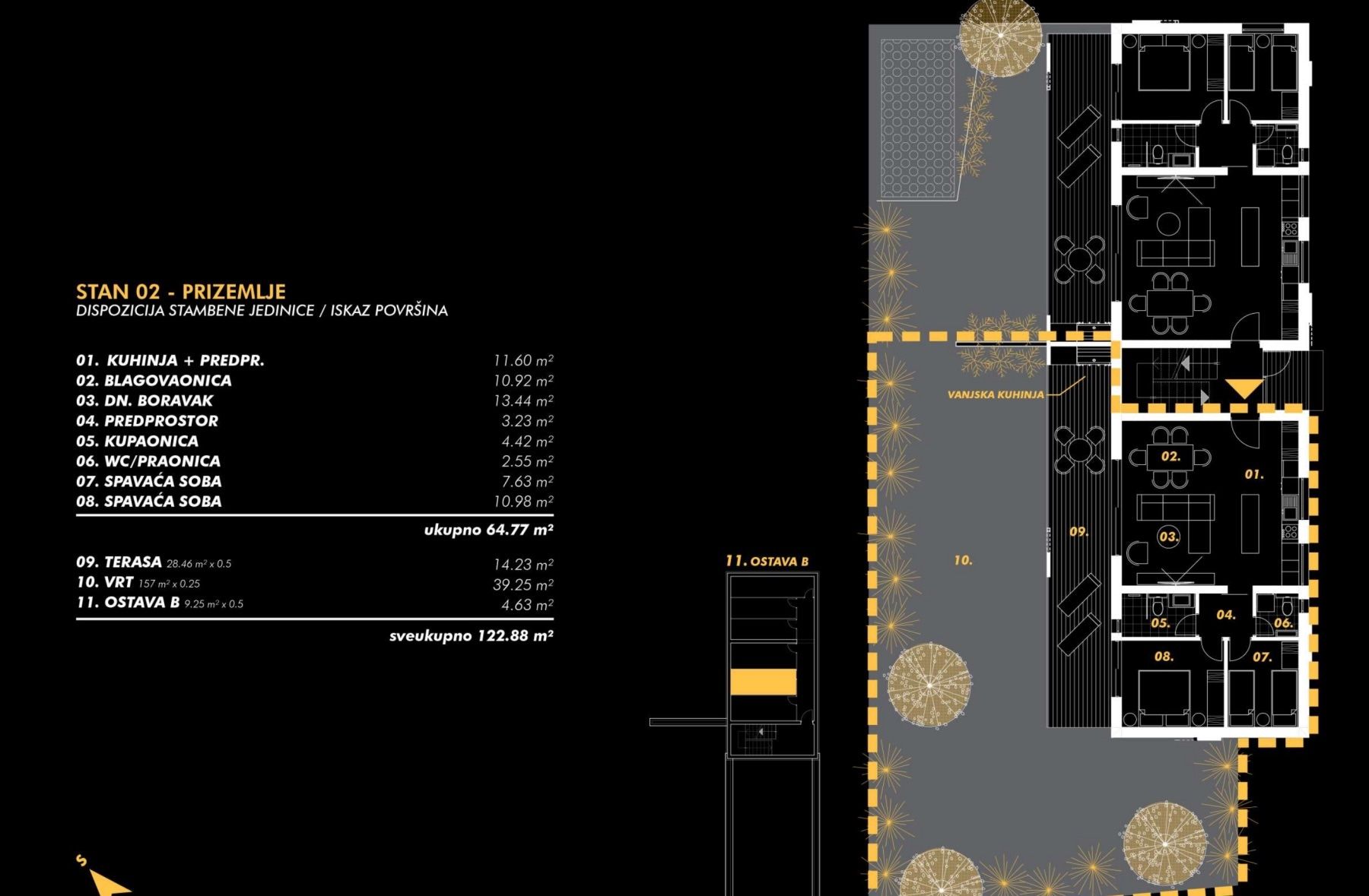 Stan S-02 – prizemlje – stambena površina 64,77 m2 (2 spavaće sobe + kupaonica + WC) + terasa (28 m2) + vrt (157 m2 - J-Z) + ostava (9 m2), neto obračunske površine 125,38 m2 = 343.000 EUR