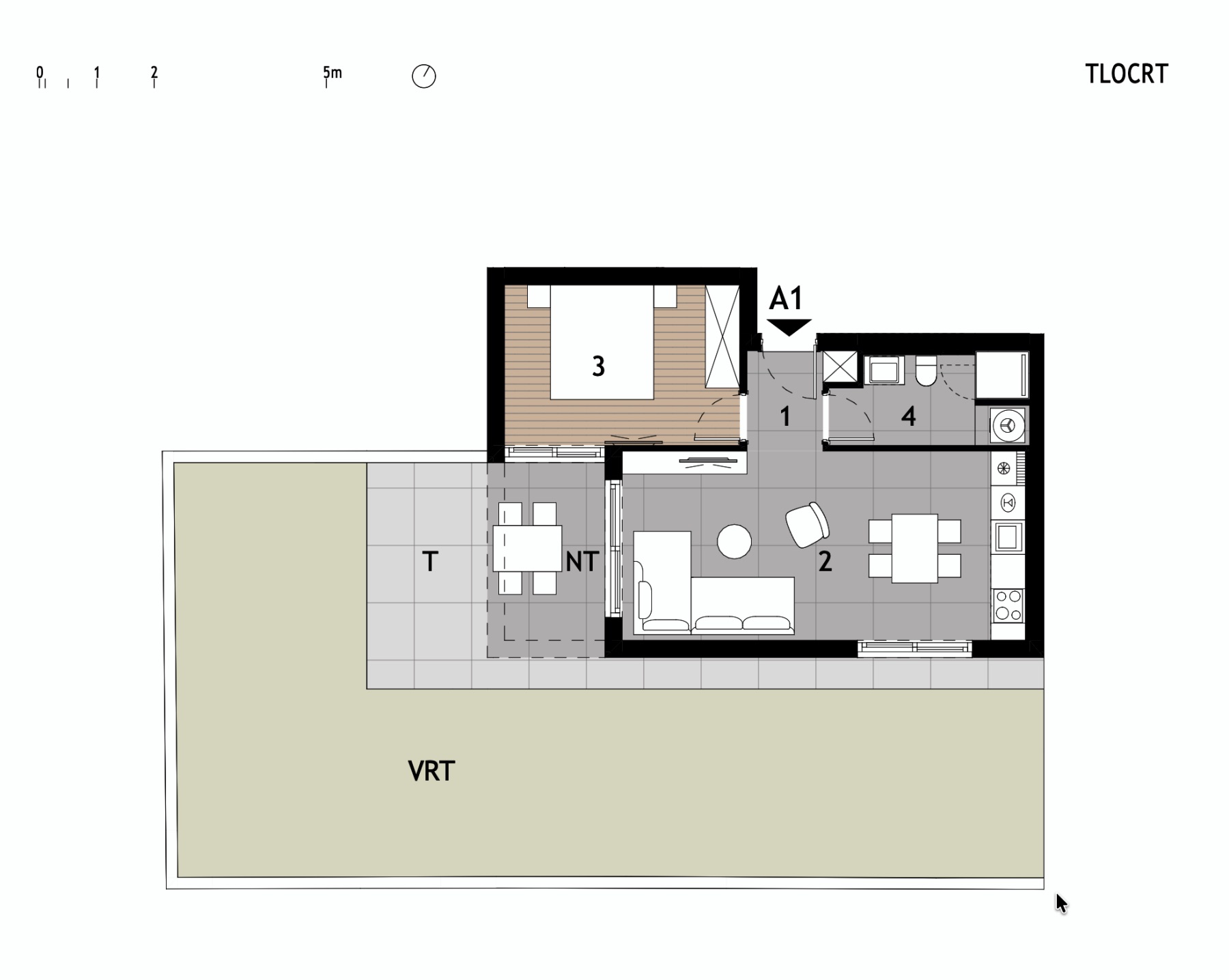 Stan A1 - (prizemlje) - stambena površina 42,46 m2 (1 spavaća soba + 1 kupaonica) + natkrivena terasa (6,97 m2 - JZ) + nenatkrivena terasa (14 m2 - JZ) + vrt (68 m2) + vanjsko parking mjesto; ukupna neto površina 69,21 m2 = 281.000 EUR (s uključenim PDV-om)