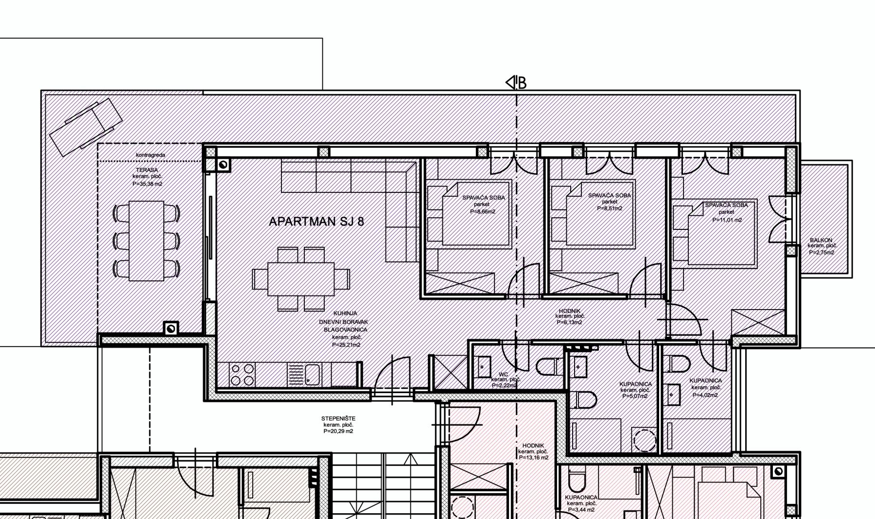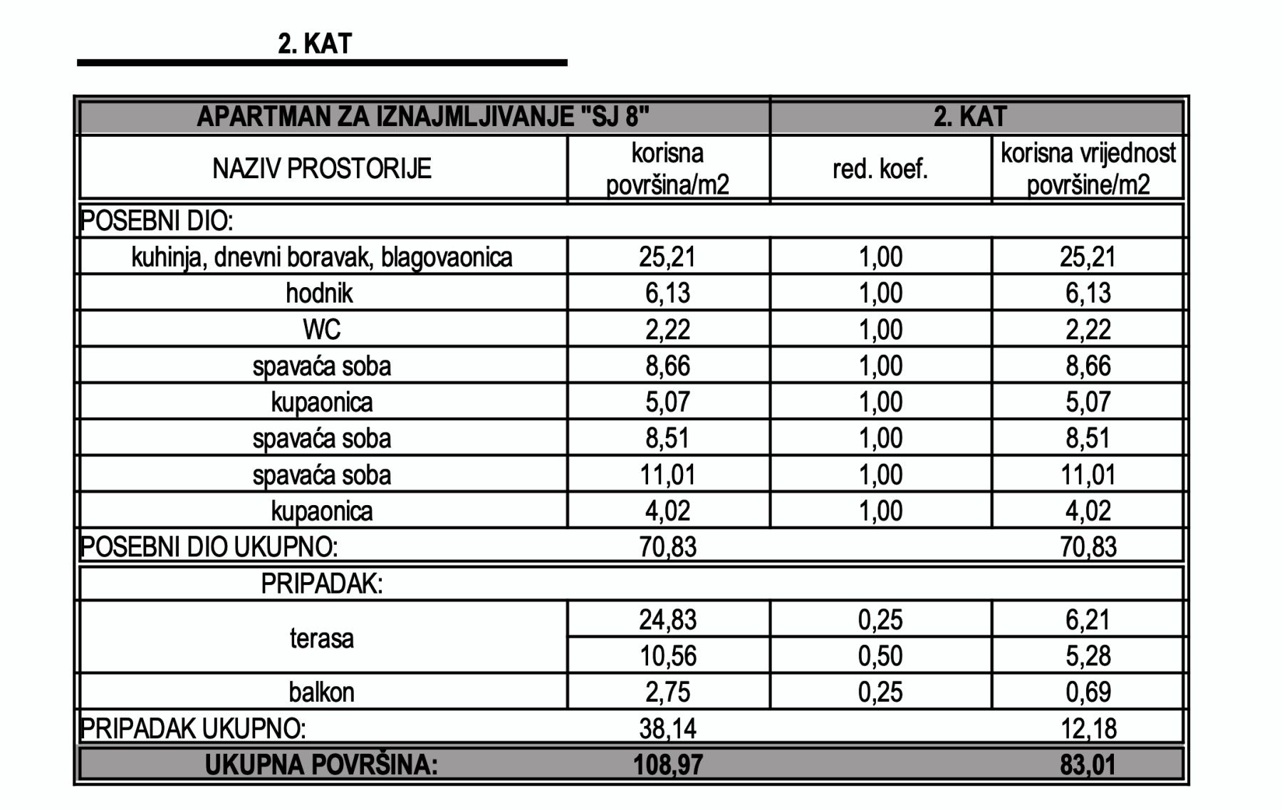 Apartman A-8 - 2. kat - stambena površina 70,83 m2 (3 spavaće sobe + 2 kupaonice + WC) + terasa (35 m2 - SZ) + balkon (3 m2 - JI) + krovna terasa (85 m2) + garažno parkirno mjesto + ostava u podrumu, neto obračunske površine 113,82 m2 = 512.190 EUR